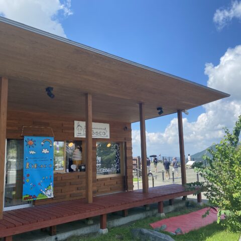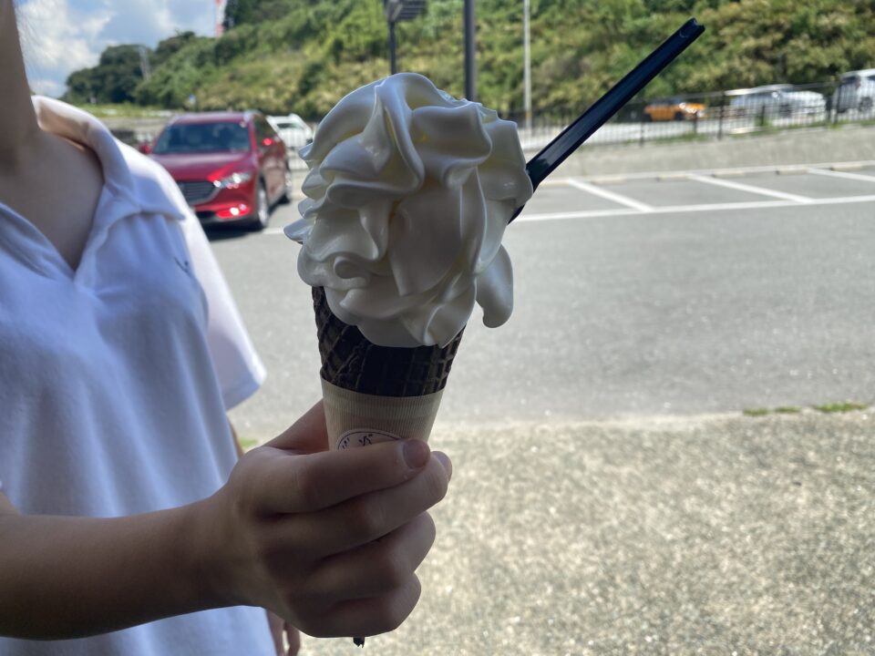 雄大な景色を見ながら堪能するソフトクリーム。凄く滑らかで、阿蘇産の牛乳を使った濃厚なソフトクリームです。